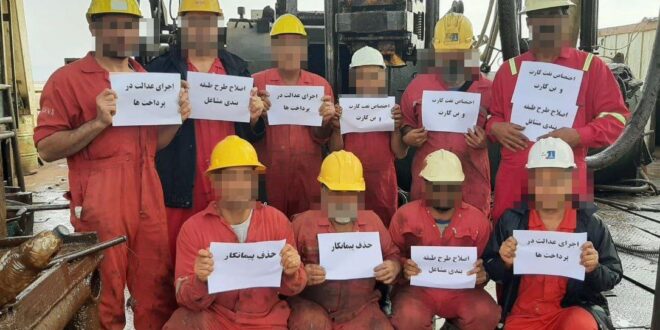 شماری از کارگران حفاری ارکان ثالث شرکت ملی حفاری و کارکنان مناطق نفت خیز جنوب روز یکشنبه 19 فروردین ماه در اعتراض به ظلم و بیعدالتی پیمانکاران در قبال این کارگران اقدام به برگزاری تجمع کردند.
