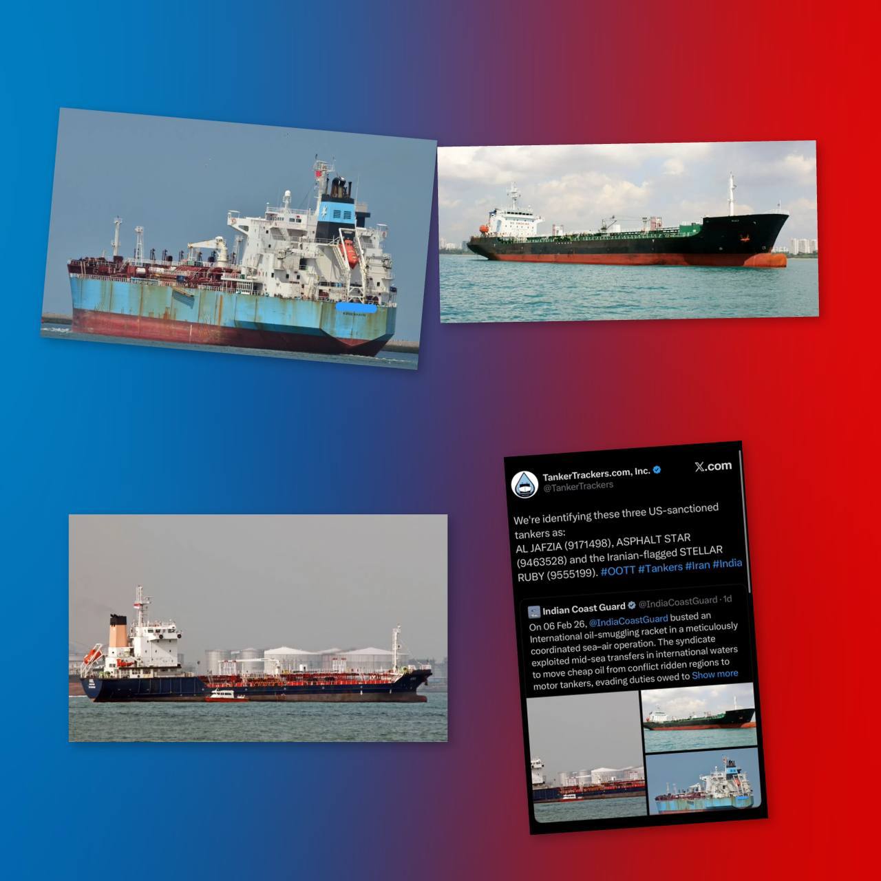 این شبکه با انتقال نفت در آبهای آزاد، تغییر هویت و پرچم کشتیها و استفاده از روشهای پیچیده برای دور زدن تحریمها، نفت ارزان استخراجشده از مناطق بحرانزده را به بازارهای جهانی منتقل میکرد. مقامهای هندی اعلام کردند که هر سه کشتی در حال حاضر تحت اسکورت به بندر بمبئی منتقل شدهاند تا روند قضایی و تحقیقات رسمی درباره آنها آغاز شود. وبسایت تخصصی رهگیری نفتکشها نیز هویت این سه شناور را بهعنوان نفتکشهای تحت تحریم ایالات متحده تأیید کرده است.