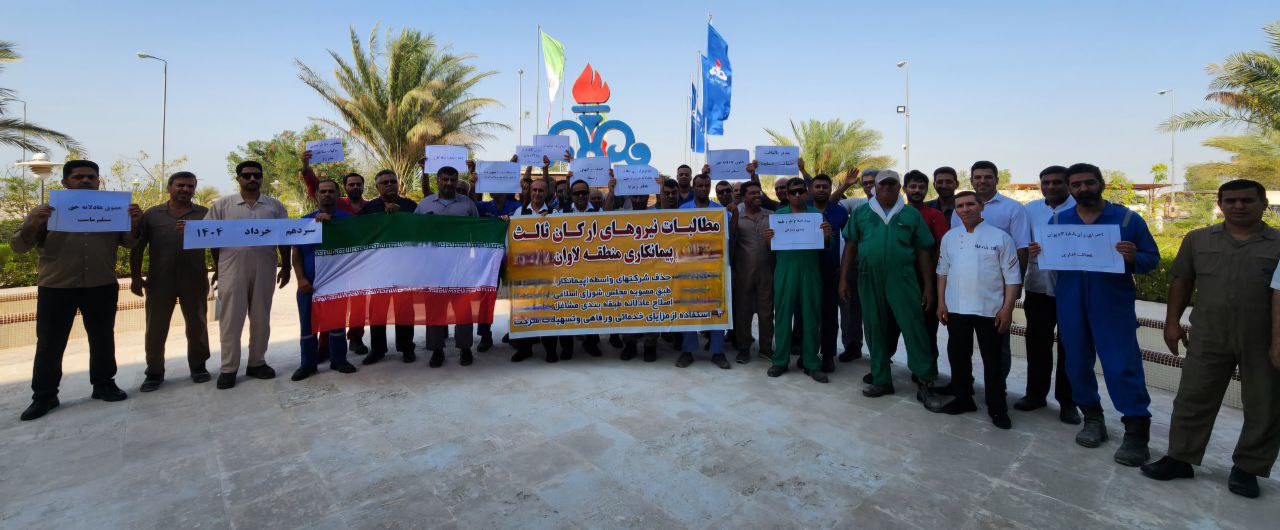 کارگران ارکان ثالث مناطق عملیاتی جنوب، روز چهارشنبه 14 خرداد ماه، با تجمع در لاوان و سکوی سلمان، خواستار حذف شرکت‌های پیمانکاری، افزایش حقوق متناسب با تورم و اجرای کامل طرح طبقه‌بندی مشاغل شدند.