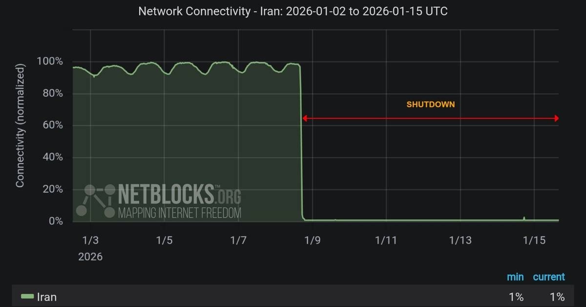 همزمان با یک هفته قطع اینترنت در ایران،گزارشهای متعددی از کشتار هزاران نفر از معترضان توسط نیروهای امنیتی در روزهای هجدهم و نوزدهم دی منتشر شده که به دلیل قطع اینترنت امکان راستیآزمایی مستقل آنها وجود ندارد.حساب نتبلاکس در شبکه ایکس شامگاه پنجشنبه ۲۵ دی نوشت:دقیقا یک هفته پیش در همین ساعت،با اعمال قطع سراسری اینترنت از سوی مقامات،ایران به تاریکی دیجیتال فرو رفت.این گروه میگوید پس از ۱۶۸ ساعت،دادهها نشان میدهد این قطعی همچنان ادامه دارد.سازمان ملل و گروههای حقوق بشری و همچنین کشورهای غربی خواستار توقف خشونت در ایران و بازگشت دسترسی شهروندان به اطلاعات و اینترنت شدهاند.