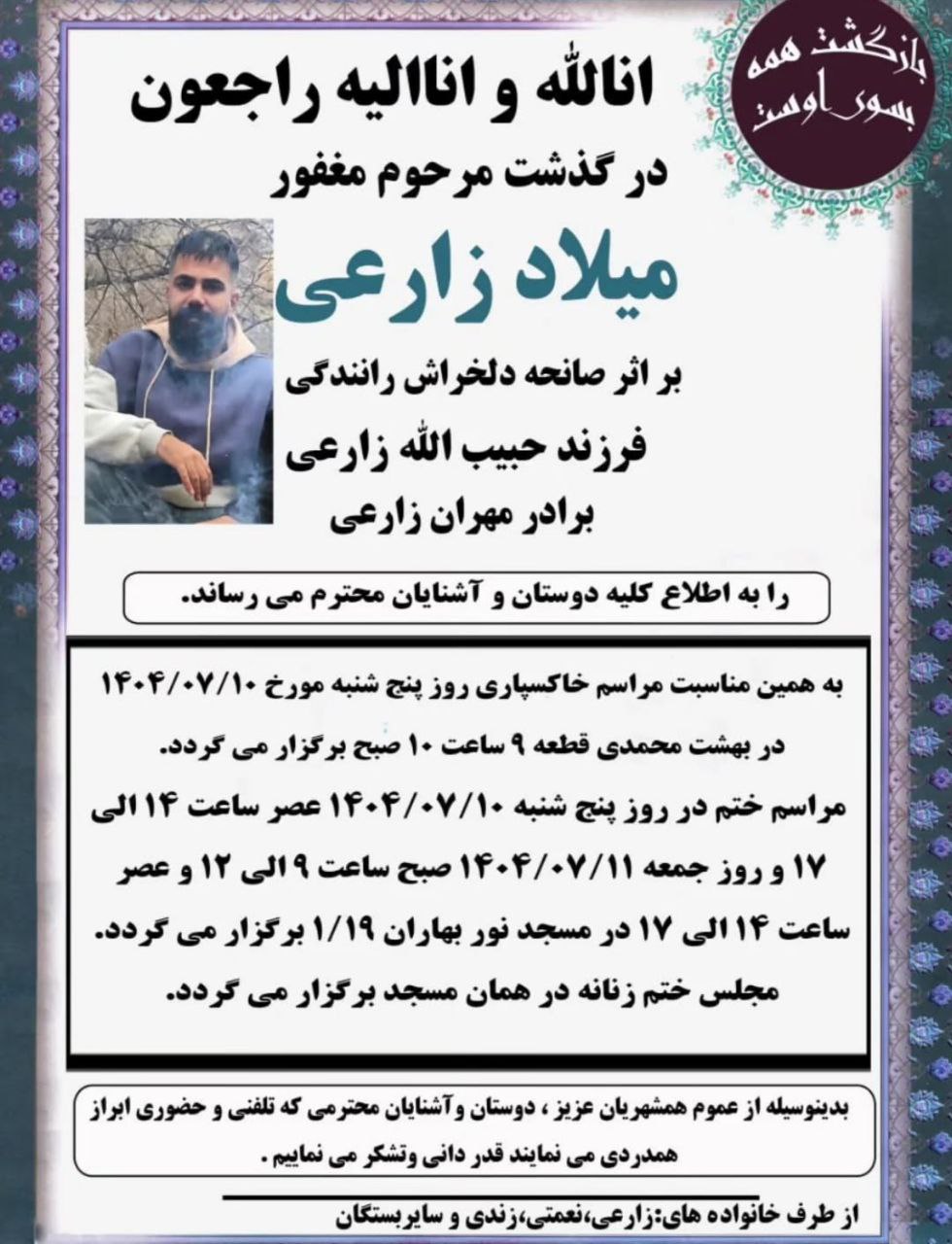 برپایه گزارش دریافت شده،روز پنجشنبه ۱۰ مهرماه میلاد زارعی از جوانان انقلابی و از مجروحان خیزش ژینا امینی در اثر سانحه رانندگی در شهر سنندج جان باخت.