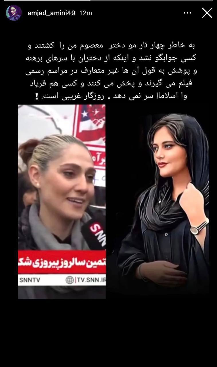 امجد امینی، پدر مهسا (ژینا) امینی، در واکنش به حضور برخی زنان حکومتی با حجاب اختیاری در راهپیمایی ۲۲ بهمن، با انتشار عکسی از دختر جانباختهاش نوشت: به خاطر چهار تار مو دختر معصوم من را کشتند و کسی جوابگو نشد و اینکه از دختران با سرهای برهنه و پوشش به قول آنها غیرمتعارف در مراسم رسمی فیلم میگیرند و پخش میکنند و کسی هم فریاد وا اسلاما سر نمیدهد. در ادامه واکنشها، مژگان افتخاری، مادر دادخواه ژینا (مهسا) امینی، نیز در استوری اینستاگرام خود با انتشار پیامی سرشار از اندوه، به کشتار گسترده معترضان در دیماه واکنش نشان داد و نوشت که اکنون برای یک ایران سوگوار است و خود را در کنار هزاران مادر داغدار دیگر میبیند؛ مادرانی که فرزندانشان در جریان اعتراضات اخیر با گلوله جنگی، ساچمه یا در پی شکنجه جان باختهاند.