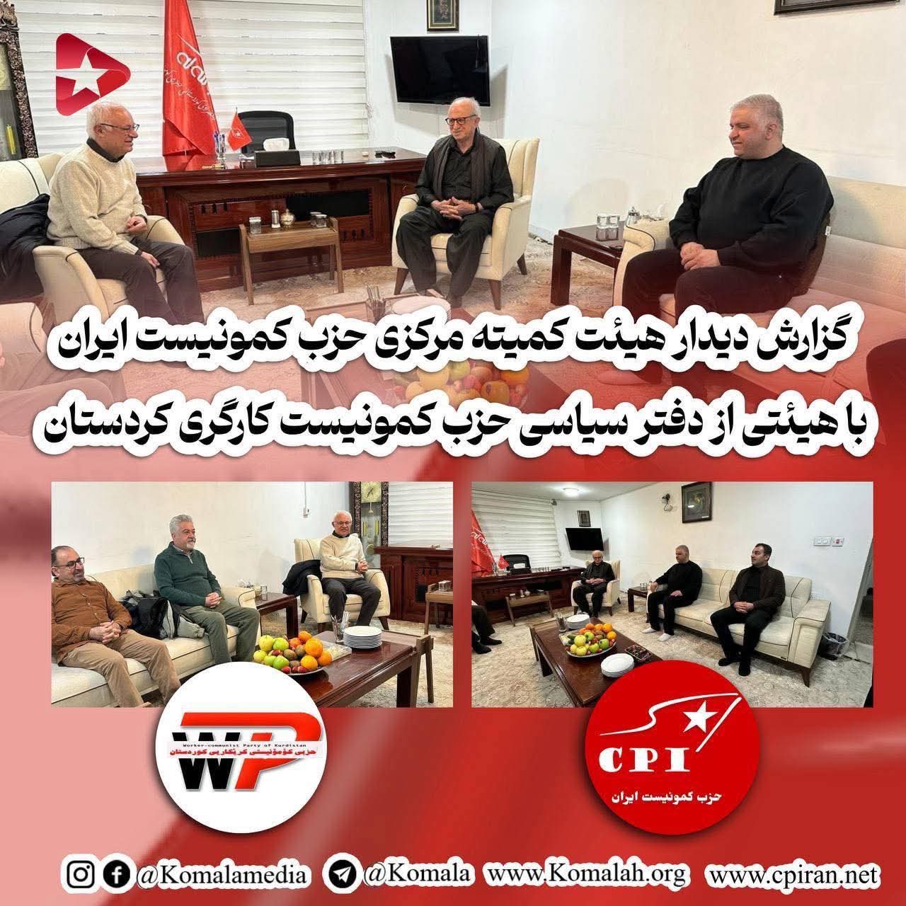 روز پنجشنبه ٢٩ ژانویه ۲۰۲۶، برابر با ۹ بهمن ۱۴۰۴، هیئتی از دفتر سیاسی حزب کمونیست کارگری کردستان، متشکل از رفقا عثمان حاجی مارف (دبیر کمیته مرکزی)، دشتی جمال و جمال محسن،از اعضا دفتر سیاسی حزب با هیئتی از کمیته مرکزی حزب کمونیست ایران متشکل از رفقا ابراهیم علیزاده (دبیر اول کومه له)،اسعد رستمی(دبیر کمیته اجرایی حزب) و فواد سلطانی ( عضو کمیته مرکزی حزب) دیدار و گفتگو کردند.